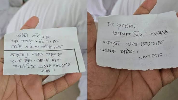 দানবাক্সে ফেলা একটি চিরকুট নামপরিচয়হীন একজন লিখেছেন—ডাইনি হাসিনাকে তার কর্মের শাস্তি না দেখা পর্যন্ত আমাকে বাঁচিয়ে রেখ আল্লাহ। অনেক আলেমকে কষ্ট দিছে। আমার প্রিয় সাঈদীকে অনেক অত্যাচার করছে। হে আল্লাহ আমার প্রিয় বাংলাদেশে একজন ওমর (রা.) এর মতো শাসক পাঠাও।